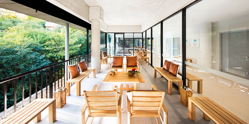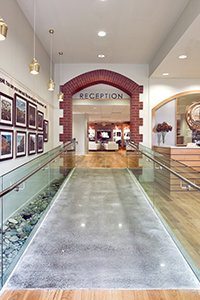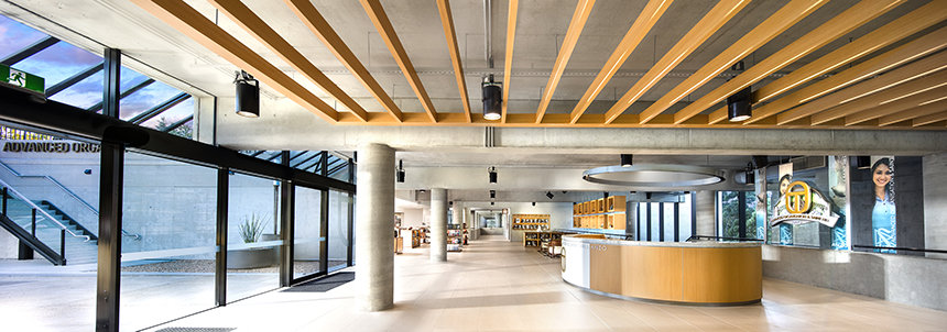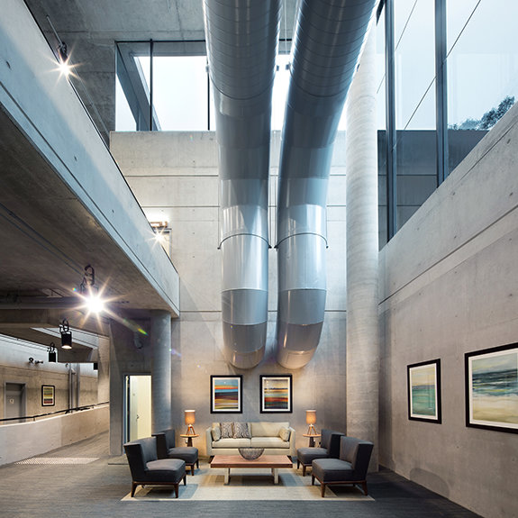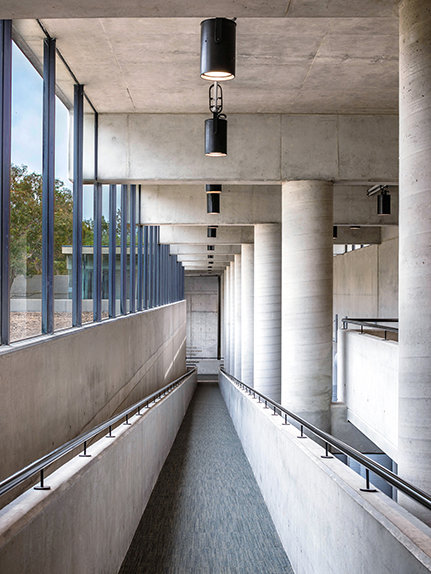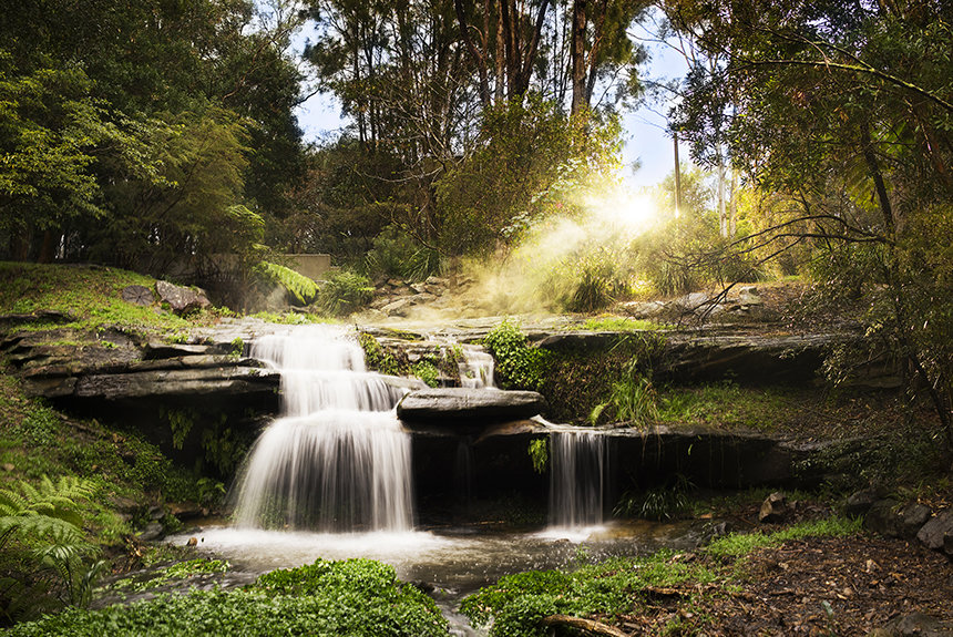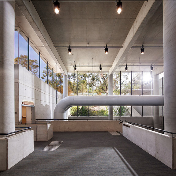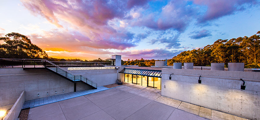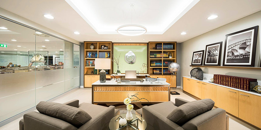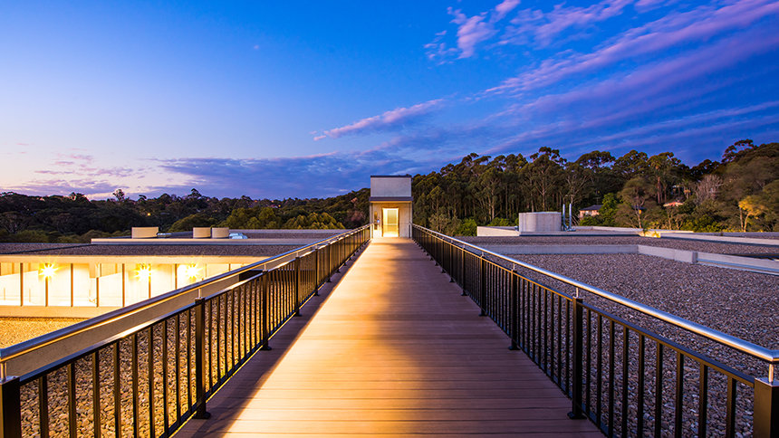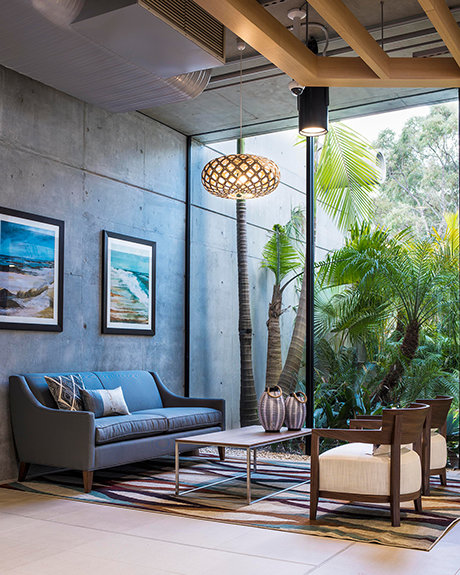 The ultra-modern structure presents a minimalist style with multi-story glass blending into a striking concrete landscape. Outside, the Blue Gum Creek wends its way through the 8.5-acre eucalyptus forest, a virtual Garden of Eden in the heart of Sydney’s metropolitan area.