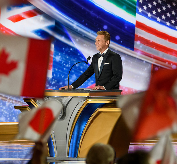 Mr. Miscavige welcomes Scientologists and guests to a night alight with color and triumph as flags wave, spirits soar and the crowd rises in joy.